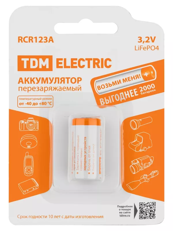 / Аккумулятор RCR123A 3,2 В 450 м*Ач Li-Ion, BP-1, TDM