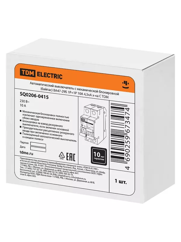 / Автоматический выключатель с механической блокировкой (байпас) ВА47-29Б 1Р+1Р 10А 4,5кА х-ка C TDM