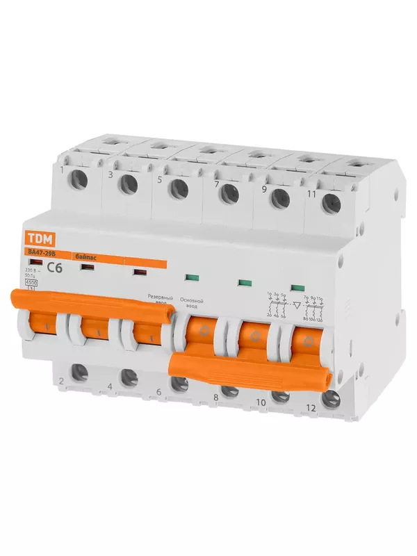 Автоматический выключатель с механической блокировкой (байпас) ВА47-29Б 3Р+3Р 6А 4,5кА х-ка C TDM