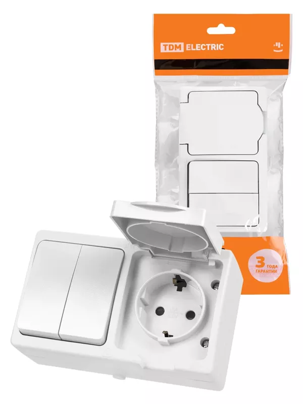 / Блок (горизонтальный) выключатель 2-кл. + розетка 2П+З с з/ш БКВР IP54 белый «Вуокса» TDM