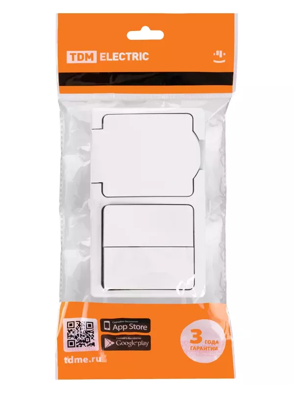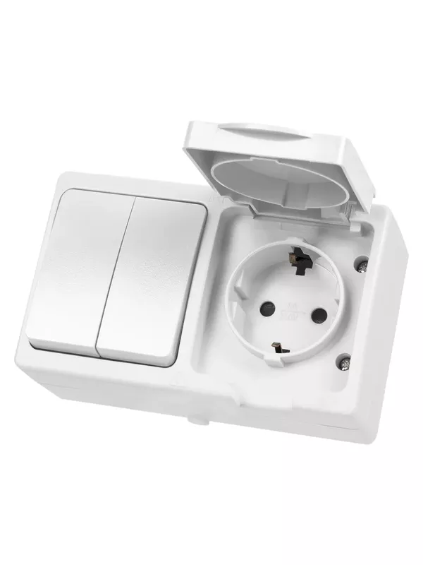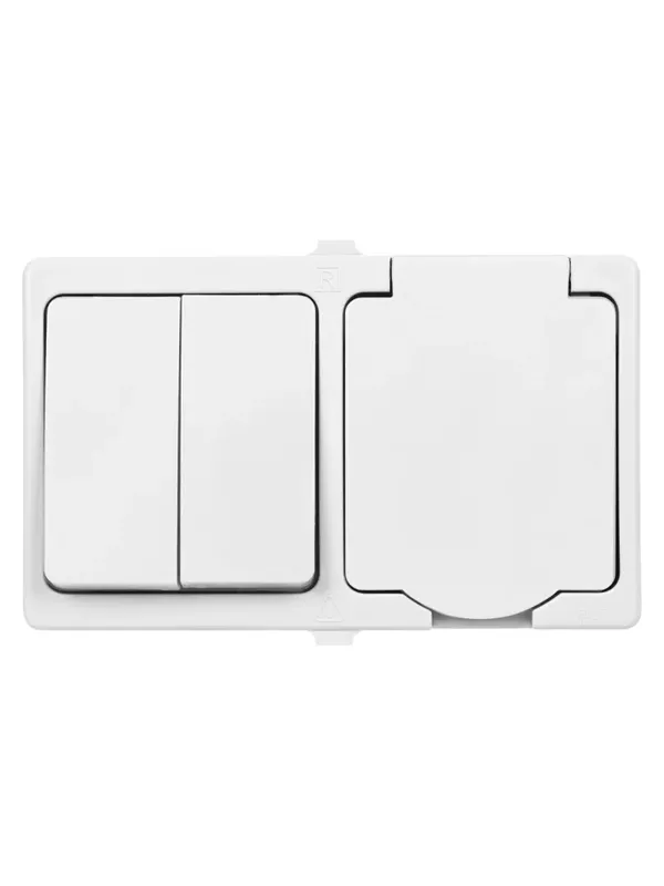 Блок (горизонтальный) выключатель 2-кл. + розетка 2П+З с з/ш БКВР IP54 белый «Вуокса» TDM