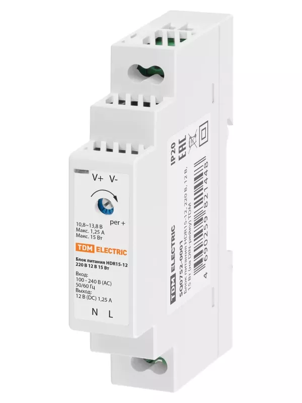 / Блок питания HDR15-12, 220 В, 12 В, 15 Вт (на DIN-рейку) TDM