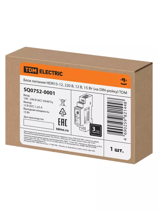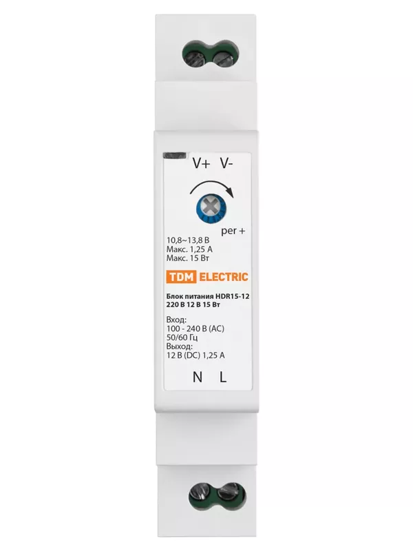Блок питания HDR15-12, 220 В, 12 В, 15 Вт (на DIN-рейку) TDM