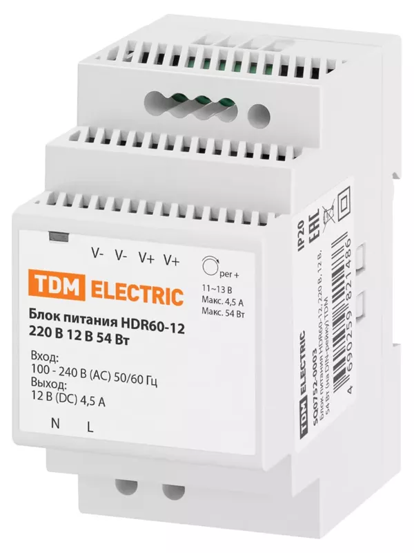 / Блок питания HDR60-12, 220 В, 12 В, 54 Вт (на DIN-рейку) TDM