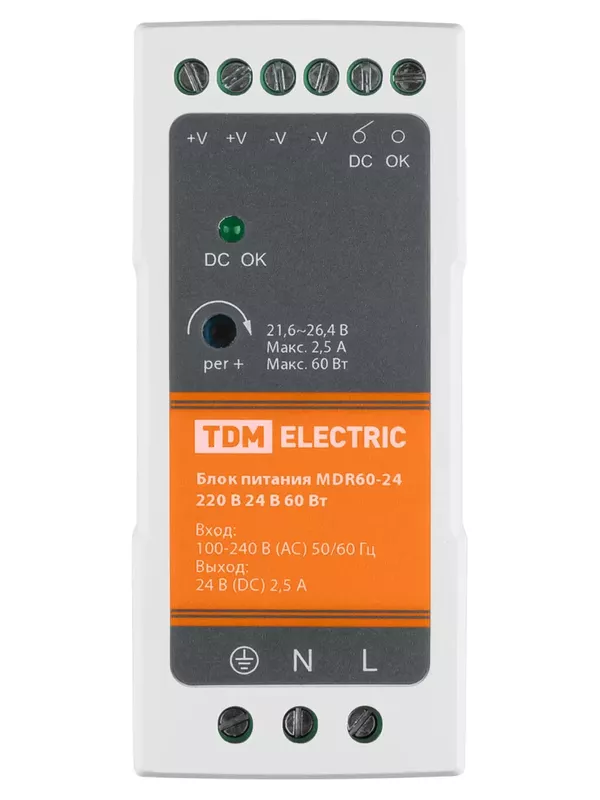 Блок питания MDR60-24, 220 В, 24 В, 60 Вт (на DIN-рейку) TDM