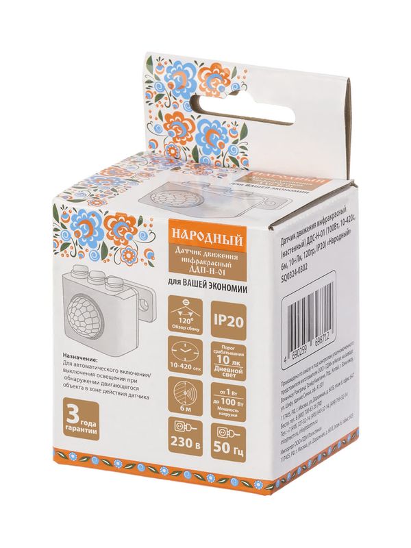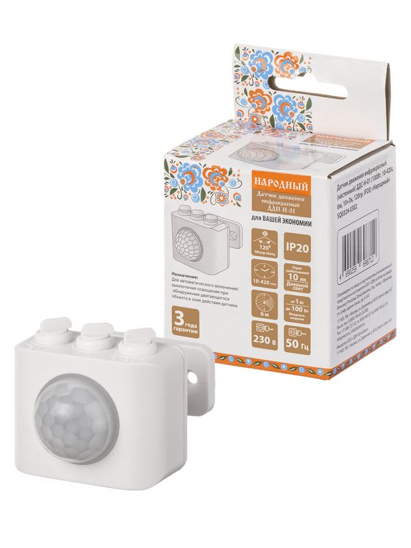 / Датчик движения инфракрасный (настенный) ДДС-Н-01 (100Вт, 10-420с, 6м, 10+Лк, 120гр, IP20) «Народный»