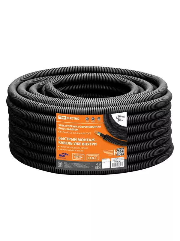 / Электротруба гофрированная ПНД d16 черн., с кабелем ВВГ-Пнг(А)-LS 3х1,5ок(N,PE)-0,66 ГОСТ (50 м) TDM