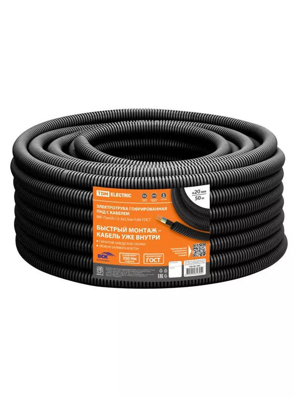 Электротруба гофрированная ПНД d20 черн., с кабелем ВВГ-Пнг(А)-LS 3х2,5ок(N,PE)-0,66 ГОСТ (50 м) TDM