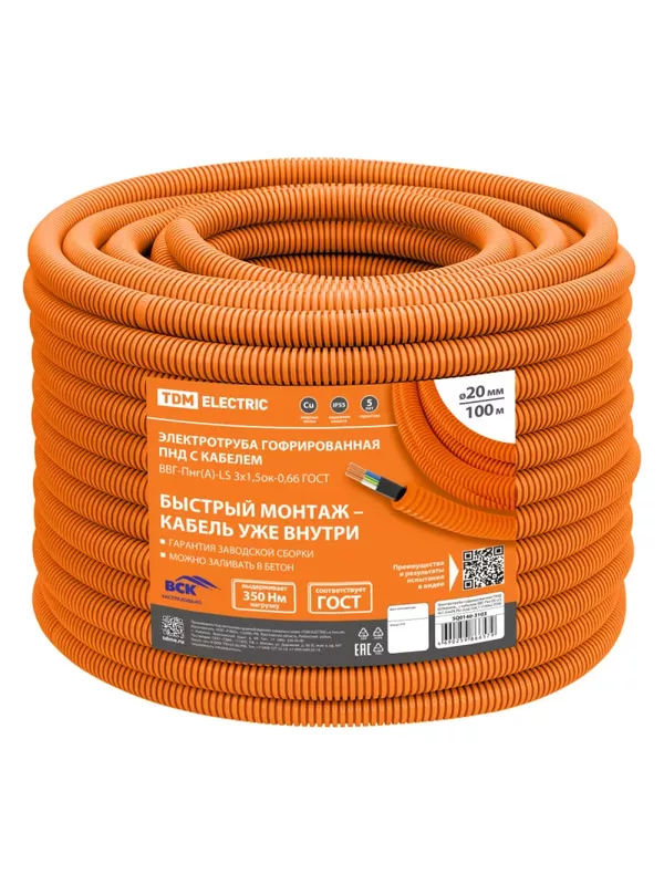 / Электротруба гофрированная ПНД d20оранж., с кабелем ВВГ-Пнг(А)-LS 3х1,5ок(N,PE)-0,66 ГОСТ (100м) TDM