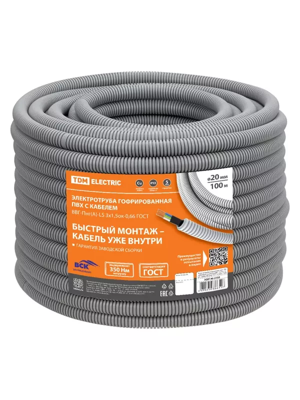 / Электротруба гофрированная ПВХ d20серая, с кабелем ВВГ-Пнг(А)-LS 3х1,5ок(N,PE)-0,66 ГОСТ (100 м) TDM