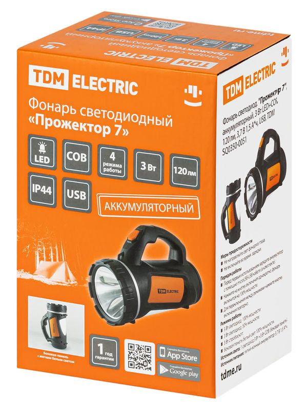 / Фонарь светодиод. «Прожектор 7», аккумуляторный, 3 Вт LED+COB, 120 лм, 3,7 В 1,5 А*ч, USB, TDM