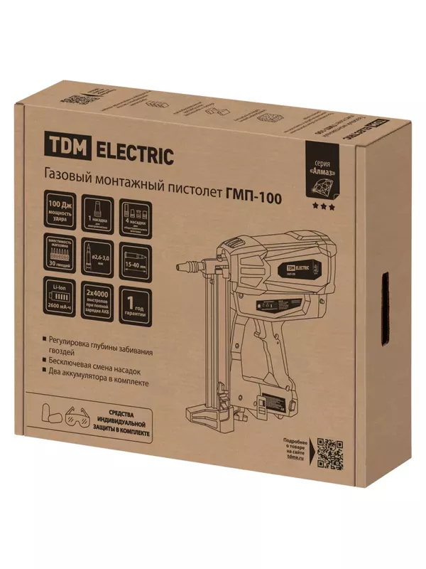 / Газовый монтажный пистолет ГМП-100, 100 Дж, 8,4 В, 2,6 А*ч Li-Ion 2 шт, очки, рюкзак, «Алмаз» TDM