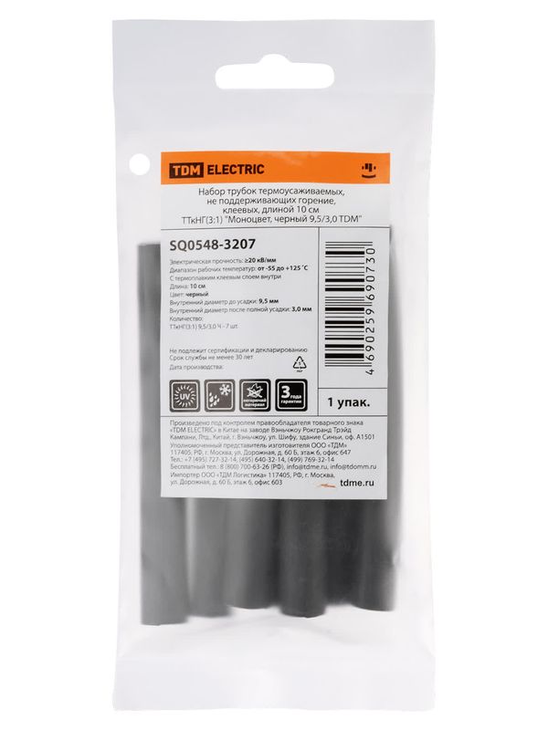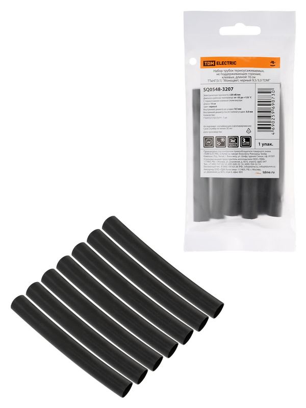 / Набор трубок термоусаживаемых, не поддерживающих горение, клеевых, длиной 10 см ТТкНГ(3:1) «Моноцвет, черный 9,5/3,0 TDM»