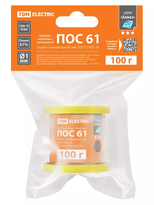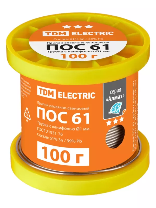 / Припой ПОС 61, трубка с канифолью, ГОСТ 21931-76, Ø1 мм, 100 г, катушка, инд. упак., «Алмаз» TDM