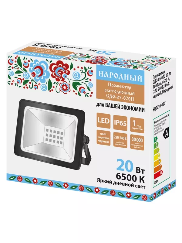 / Прожектор СДО-05-020 20 Вт, 1600 лм, 6500 К, 220-240 В, IP65, черный, Народный