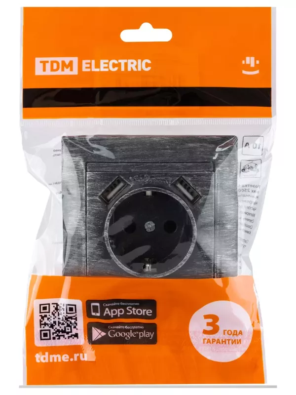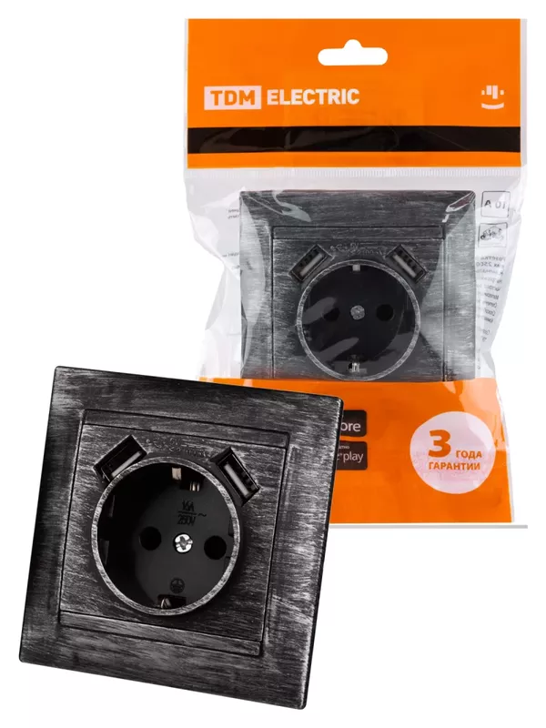 / Розетка 2П+З 16А 250В + 2 USB порта 2,1А 5В старинное серебро «Лама» TDM