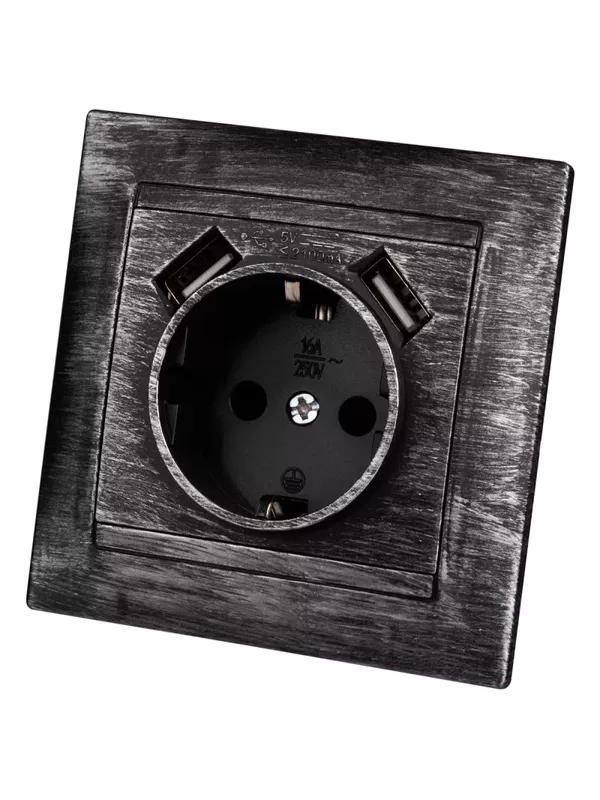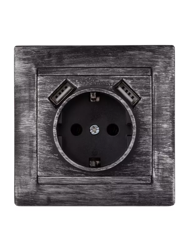 Розетка 2П+З 16А 250В + 2 USB порта 2,1А 5В старинное серебро «Лама» TDM
