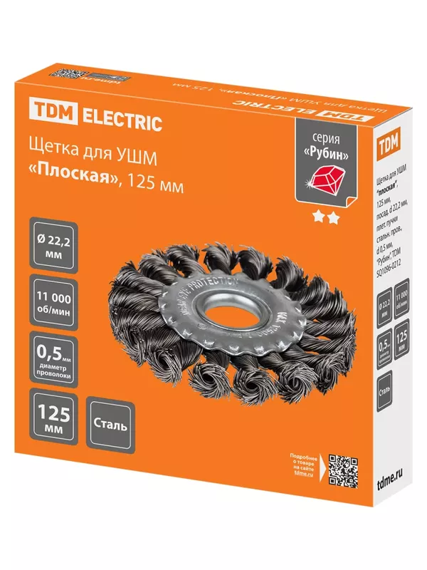 / Щетка для УШМ «плоская», 125 мм, посадка d 22,2 мм, плетеные пучки стальной проволоки d 0,5 мм, «Рубин», TDM