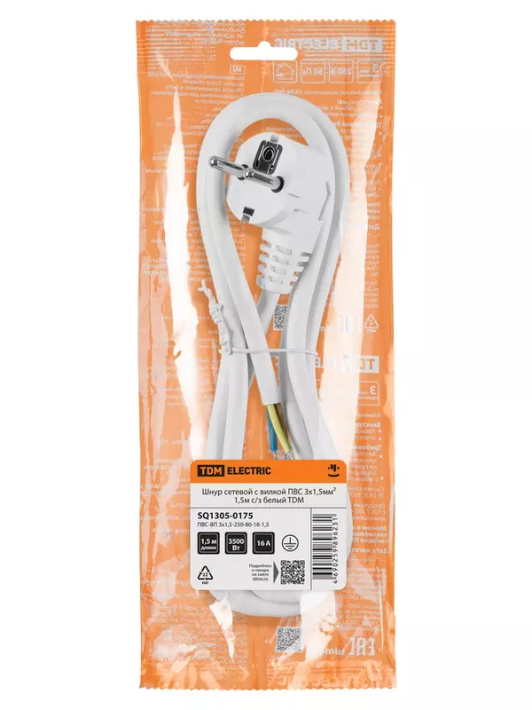 Шнур сетевой с вилкой ПВС-ВП 3х1,5мм² 1,5м с/з белый TDM