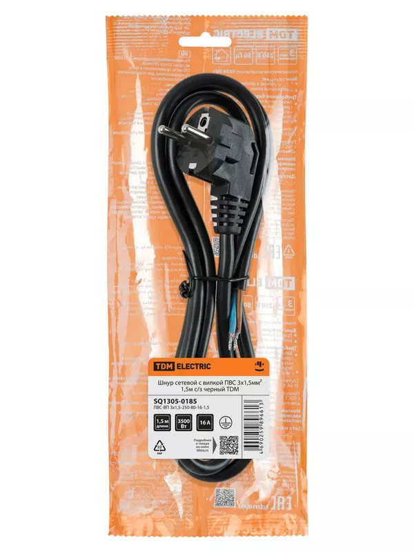 / Шнур сетевой с вилкой ПВС-ВП 3×1,5мм² 1,5м с/з черный TDM