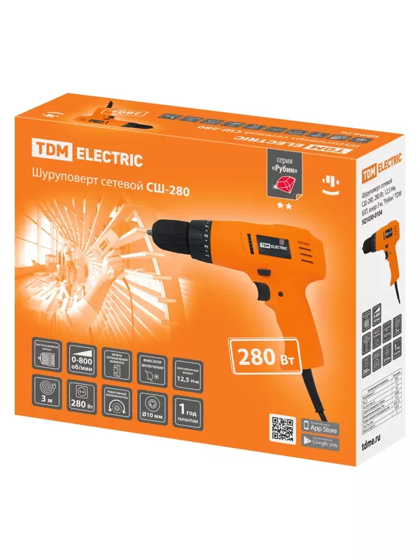 / Шуруповерт сетевой СШ-280, 280 Вт, 12.5 Нм, БЗП, шнур 3 м, «Рубин» TDM