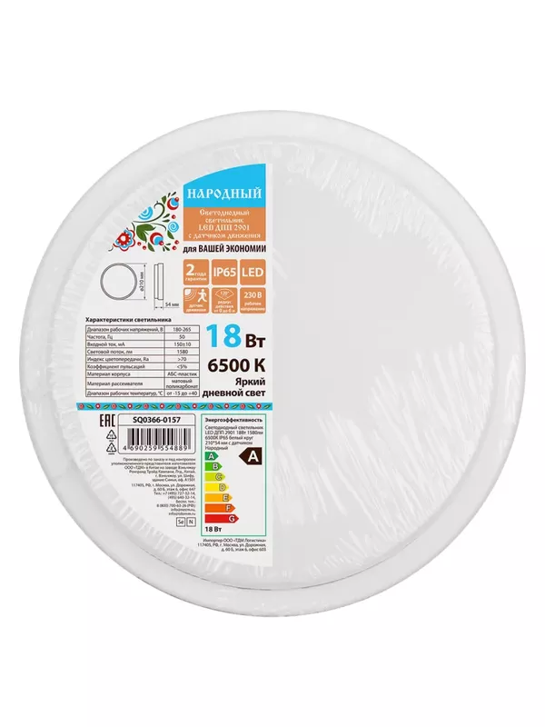 / Светодиодный светильник LED ДПП 2901 18Вт 1580 лм 6500К IP65 белый круг 210*54 мм с датчиком Народный
