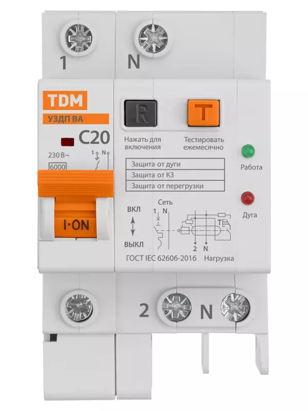 Устройство защиты от дугового пробоя (УЗДП) с автоматическим выключателем 1P+N 20А 6кА х-ка С TDM