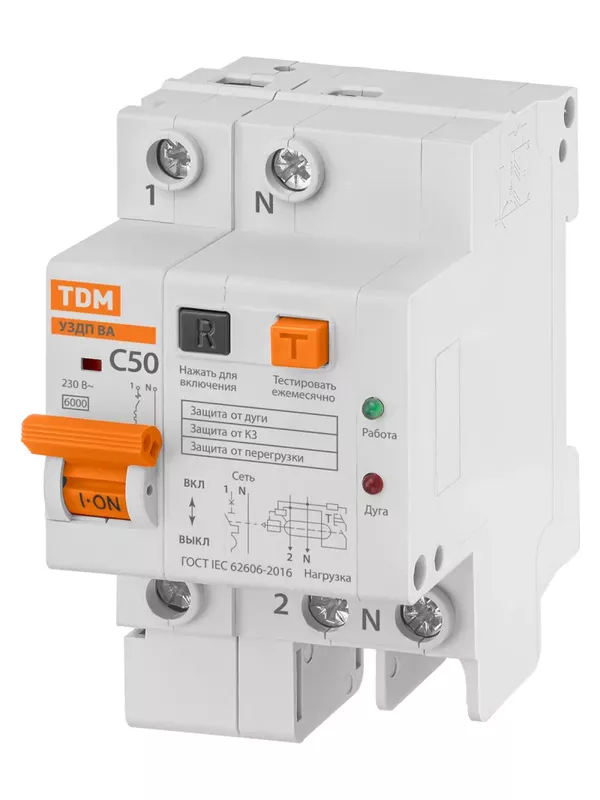 Устройство защиты от дугового пробоя (УЗДП) с автоматическим выключателем 1P+N 50А 6кА х-ка С TDM