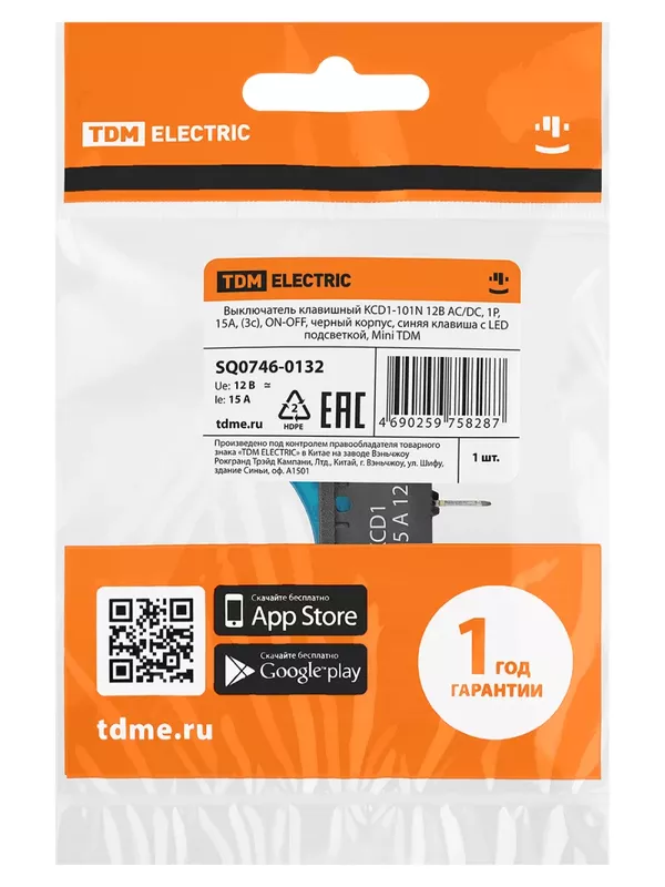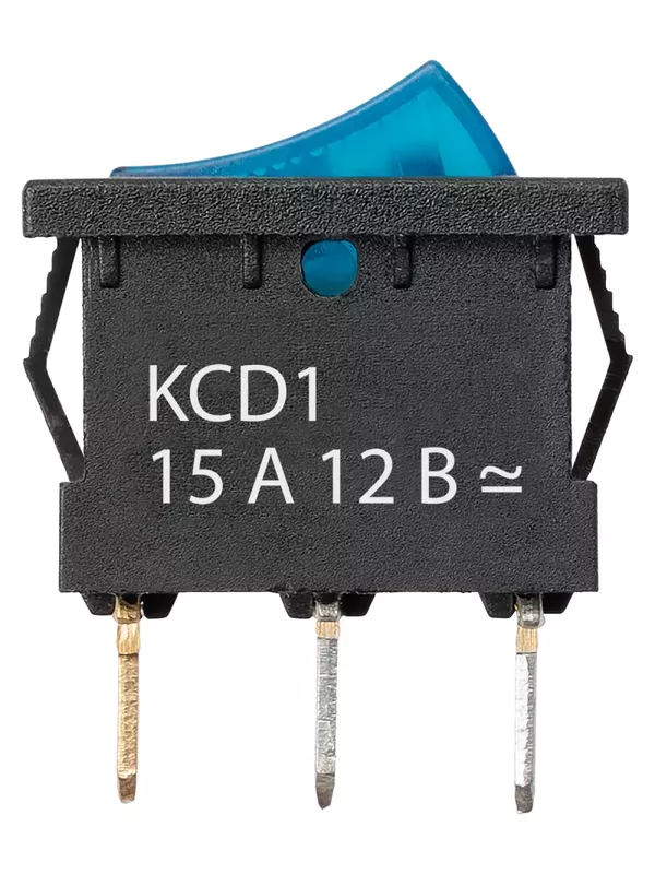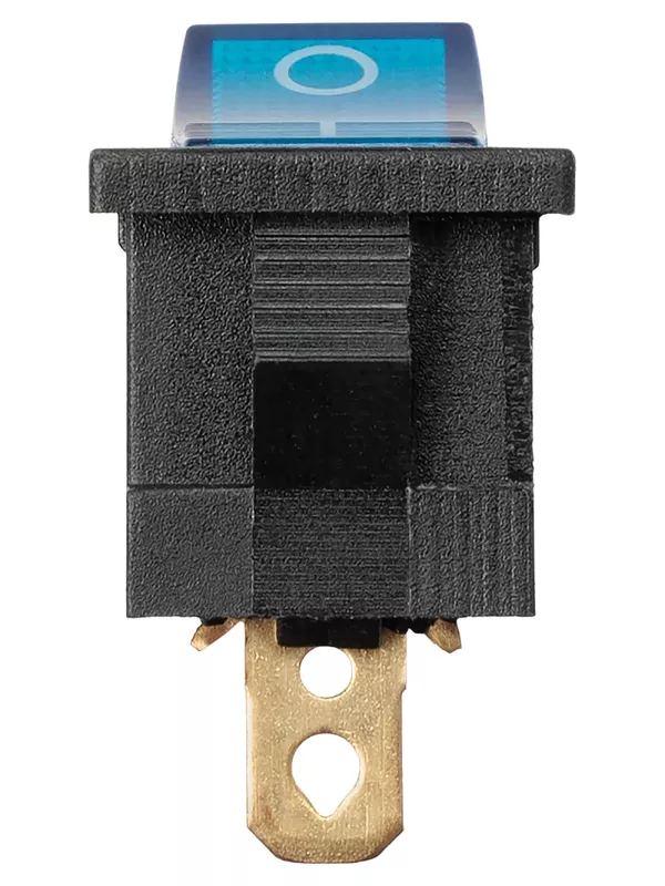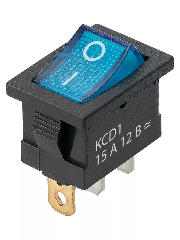 Выключатель клавишный KCD1-101N 12В AC/DC, 1P, 15А, (3с), ON-OFF, черный корпус, синяя клавиша с LED подсветкой, Mini TDM