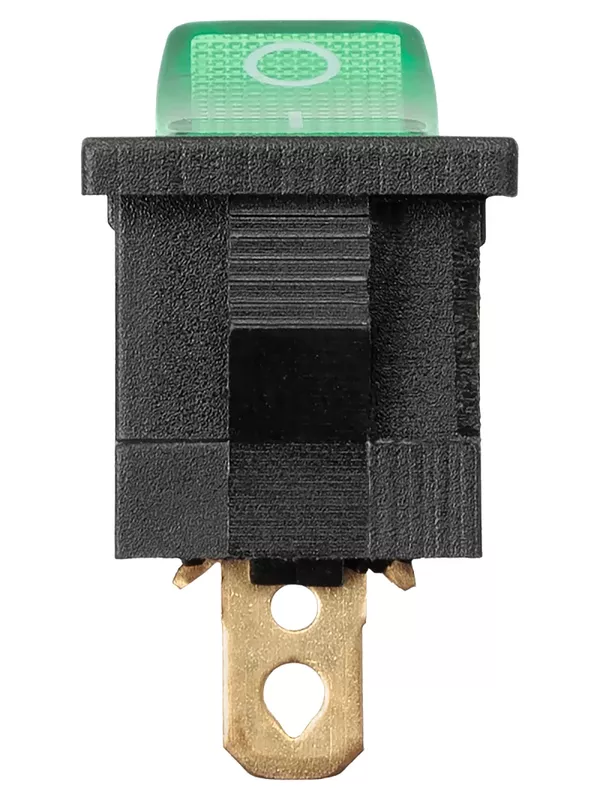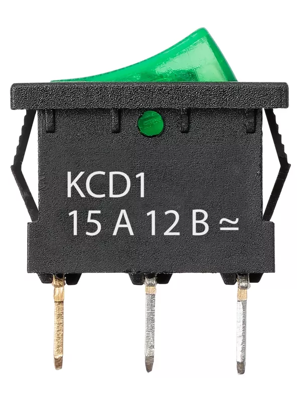 Выключатель клавишный KCD1-101N 12В AC/DC, 1P, 15А, (3с), ON-OFF, черный корпус, зеленая клавиша с LED подсветкой, Mini TDM