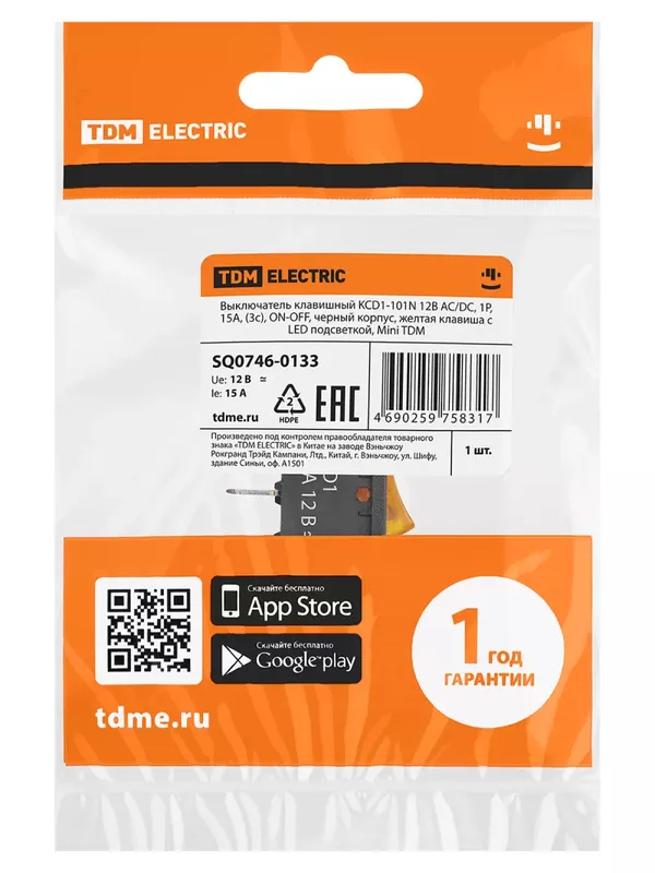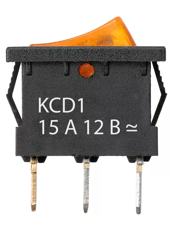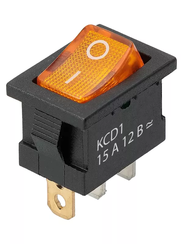 Выключатель клавишный KCD1-101N 12В AC/DC, 1P, 15А, (3с), ON-OFF, черный корпус, желтая клавиша с LED подсветкой, Mini TDM