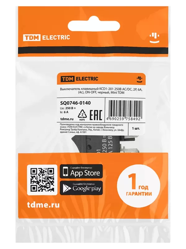 / Выключатель клавишный KCD1-201 250В AC/DC, 2P, 6А, (4с), ON-OFF, черный, Mini TDM