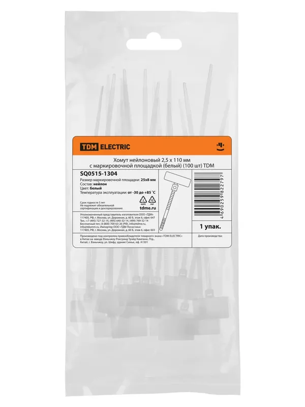 / Хомут нейлоновый 2,5 х 110 мм с маркировочной площадкой (белый) (100 шт) TDM