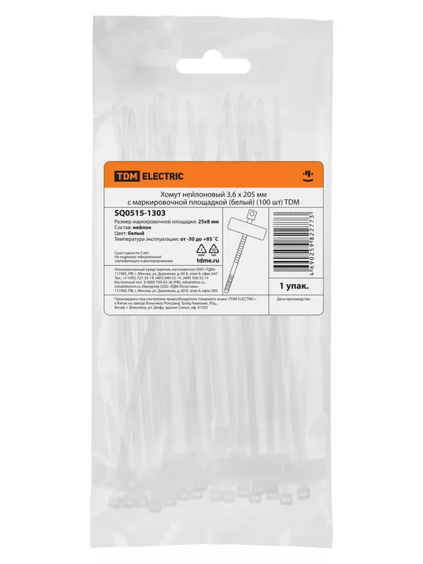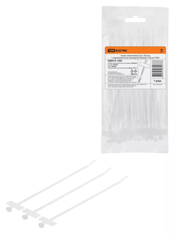 / Хомут нейлоновый 3,6 х 205 мм с маркировочной площадкой (белый) (100 шт) TDM