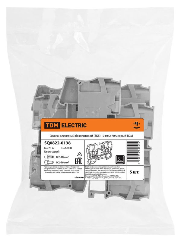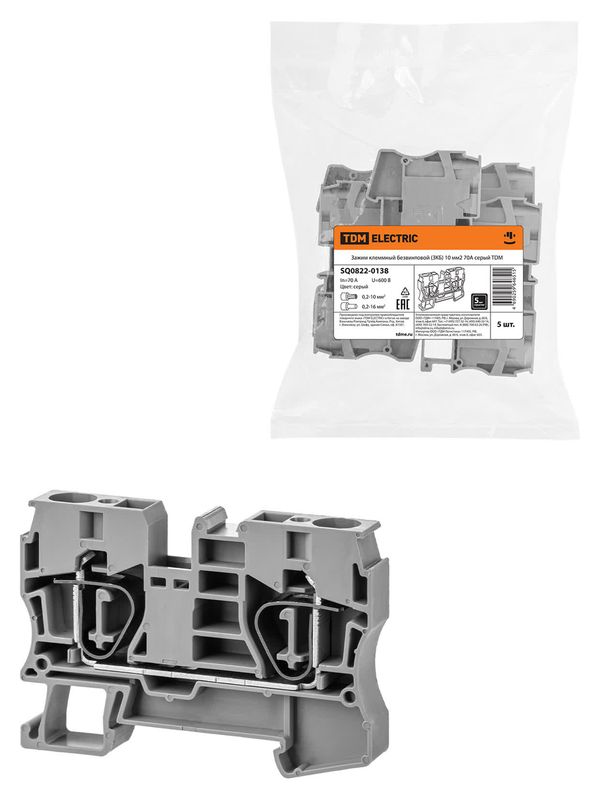 Зажим клеммный безвинтовой (ЗКБ) 10мм2 70А серый TDM